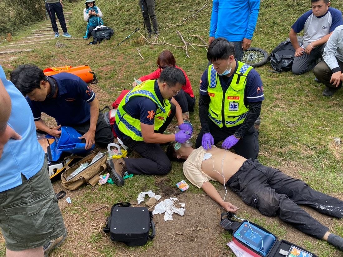 12時56分玉山國家公園管理處塔塔加管理站人員接觸張姓病患表示胸悶想吐,13時12分病患無意識無呼吸無脈搏,現場有醫護背景2名山友協助CPR,同時該局調遣集集分隊派2名EMTP啟動接駁救援,13時27分玉山國家公園管理處排雲管理站人員拿AED到達現場實施電擊七、八次,直至13時40分玉山分隊警義消到達現場,由救護人員建立進階呼吸道給氧、輸液管路及自動體外心肺復甦機CPR進行急救,14時14分OHCA病患使用鈦合金籃式擔架輕型推輪車下撤至救護車處後送竹山秀傳醫院,14時40分由EMTP在台21線131K同富隧道口處接駁後施打腎上腺素急救用藥,16時08分OHCA病患抵達竹山秀傳醫院進行救治。