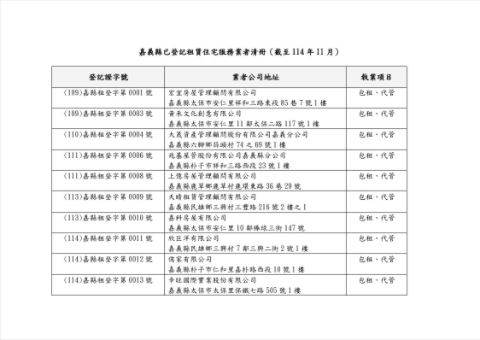 截至今日,嘉義縣依法設立登記的租賃住宅服務業者共計16家,可參考圖表或嘉義縣政府地政處官網(https://lands.cyhg.gov.tw/cp.aspx?n=1822 ,嘉義縣政府地政處首頁❯地政專區❯租賃專法專區❯租賃服務業及管理人員申辦事宜❯嘉義縣已登記之租賃住宅服務業資訊)。合法設立業者均受地政處管理與業務檢查,對租屋族而言安全有保障,共同打造有制度、宜居的嘉園。
