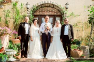 嘉義縣東石鄉蔦松社區發展協會今17日舉辦「長者圓夢婚紗日」,安排10位長輩參與生命回顧課程與創作生命故事書,接著 10 位長輩穿上婚紗及西裝,在專業團隊協助下拍攝婚紗照,縣長翁章梁也到場與長輩同歡,氣氛溫馨。