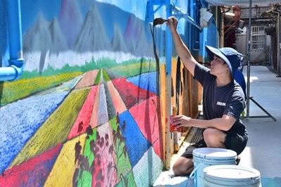 藝術家於後巷彩繪牆面中。(水利局提供)