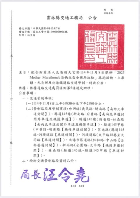 2025年北港媽祖盃全國馬拉松賽將於11月8日(星期六)在北港牛墟盛大開跑,吸引逾6千名跑者參賽。為確保比賽當日交通安全與順暢,北港警分局發布交通管制措施。警方呼籲用路人,尤其是駕駛經過賽事路線的民眾,務必小心慢行,並遵守交通規則,配合警察及協勤人員的疏導指揮,維護道路安全。